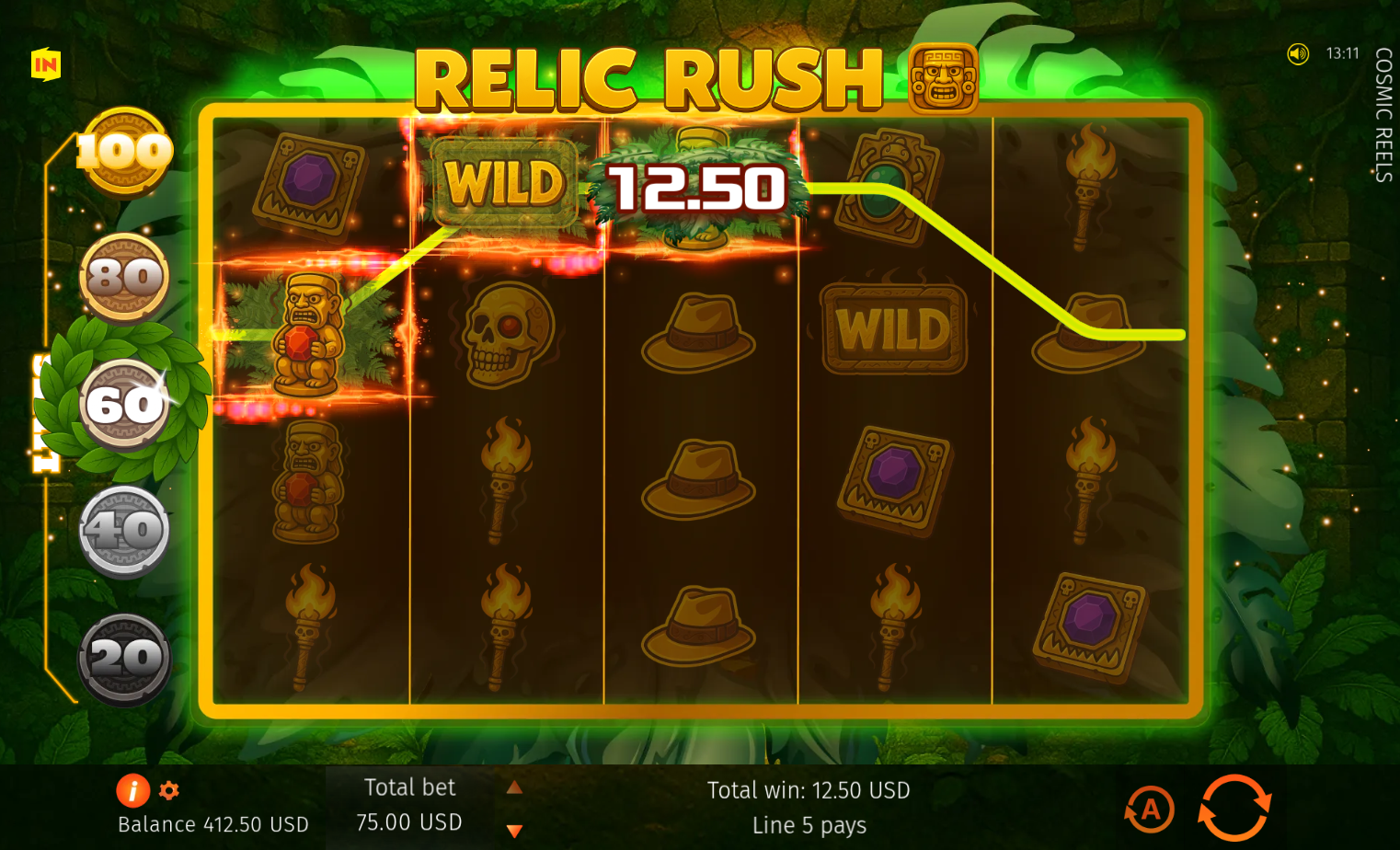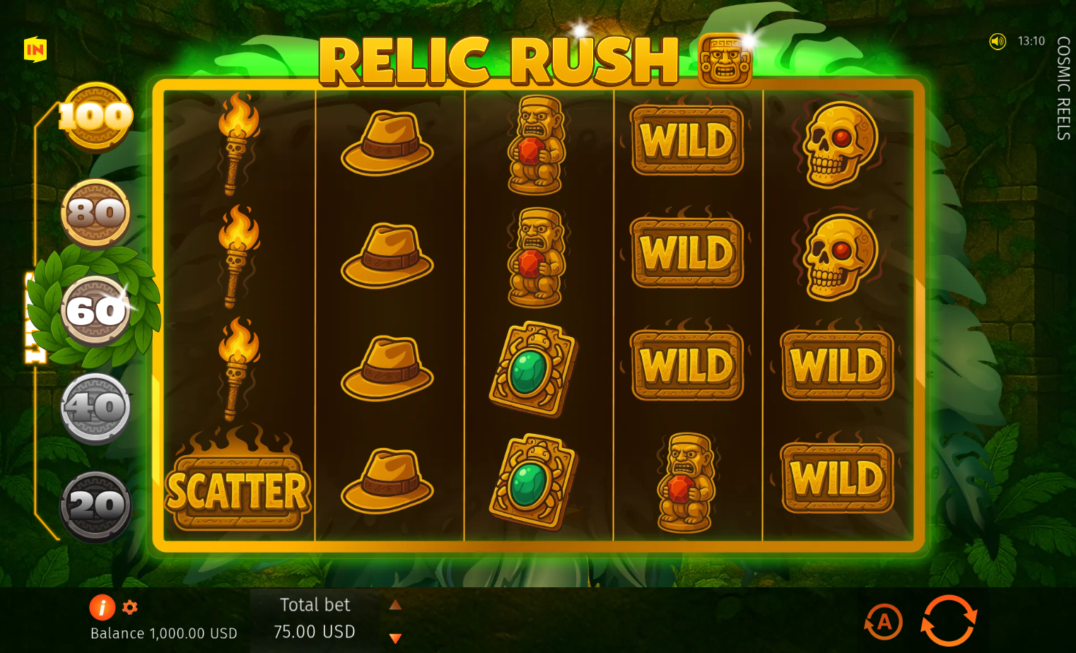 Brace yourself for jungle thrills in Relic Rush, where ancient traps, golden idols, and untold treasures await every spin! Venture deep into the wild ruins as explorer hats, flaming torches, and cursed skulls light up the reels. Stack up glowing Wilds and land powerful Scatters as you race to uncover forgotten riches hidden in the heart of the jungle. Will you escape with gold—or awaken something best left buried?